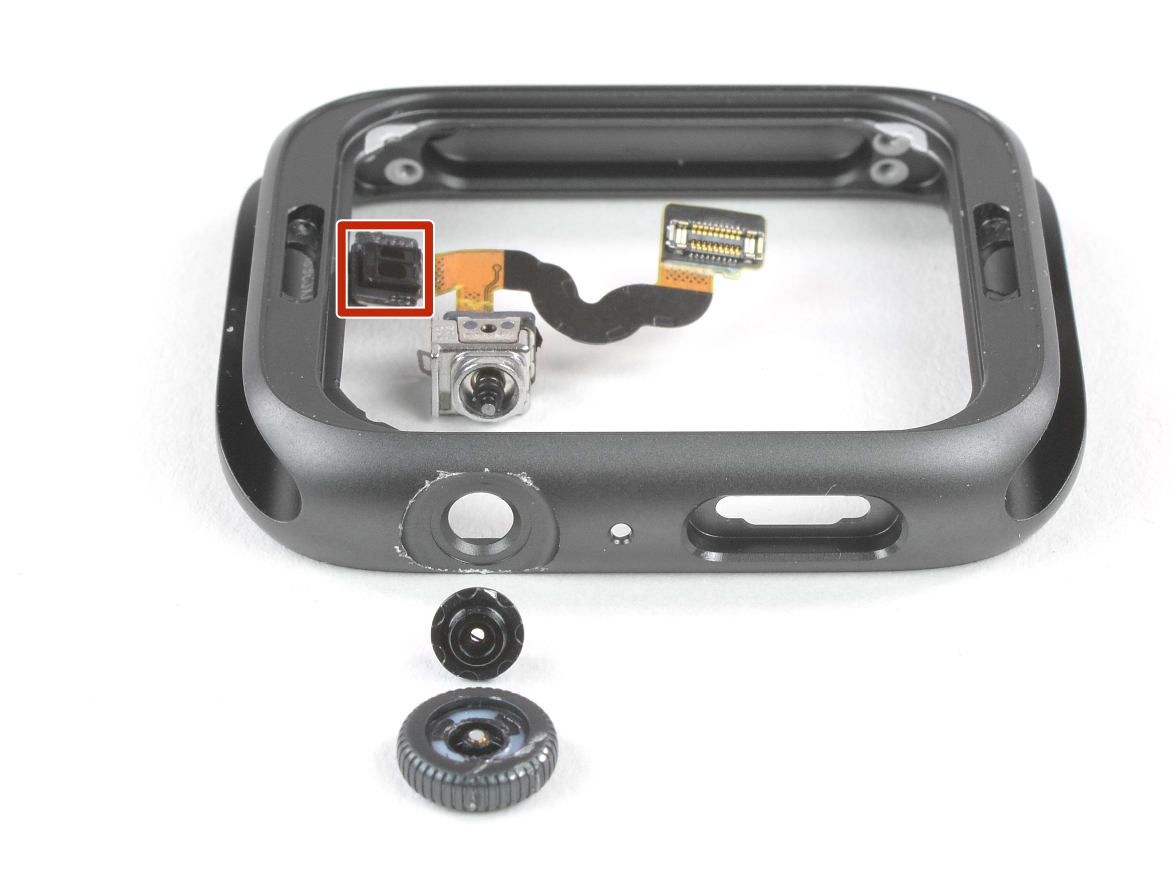 Маленький черный 'глаз', примыкающий к динамику, может быть барометрическим датчиком, ловко использующим доступ решетки динамика к внешней атмосфере. Поскольку ему больше не нужно собственное неприглядное отверстие в корпусе, как это было в Series 3, это победа Джони Айвза во всем мире.